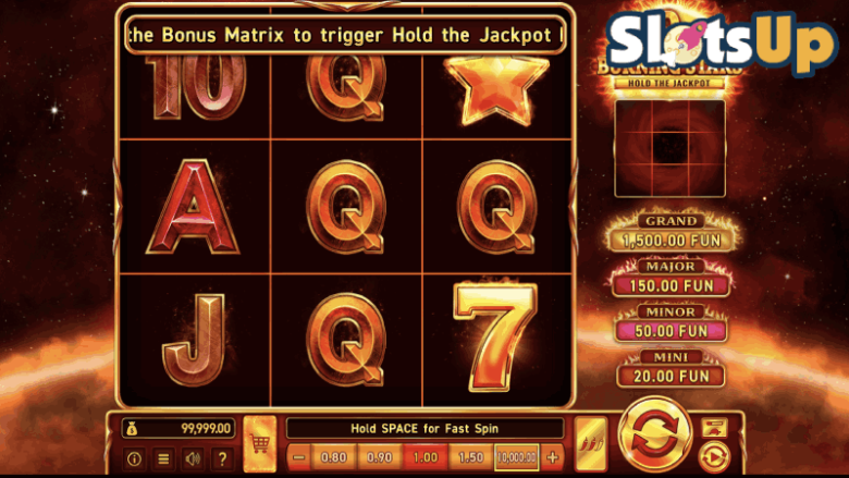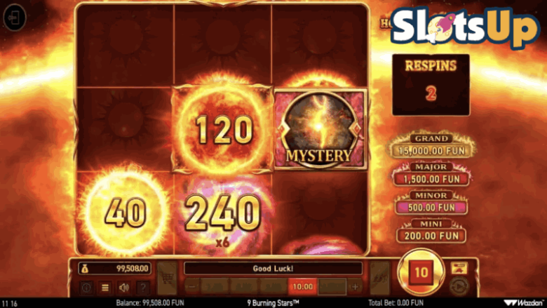 Při hraní hry 9 Burning Stars uvidíte, že se na válcích objevují další symboly. Jedná se o hořící slunce s čísly. Ta se pak uloží na bonusovou matici, kterou najdete v pravém horním rohu herní obrazovky. Jakmile se tato matice zaplní, aktivuje se bonusové kolo Hold the Jackpot.Všechny uložené symboly slunce se shromáždí do jedné hodnoty a během bonusové hry se objeví na centrálním válci. Poté získáte 3 respiny, a pokud padnou další slunce, přilepí se a vynulují počítadlo respinů na hodnotu 3. Stejně tak mohou padnout i symboly mini, menšího a většího jackpotu, které udělají totéž. Ty vám také udělí příslušný jackpot.Symbol Mystery se může během tohoto kola proměnit také v jakýkoli jiný bonusový symbol. Symbol Jackpot Mystery se promění v jeden ze tří symbolů jackpotu.Toto kolo končí, jakmile se zaplní všechny pozice nebo se počítadlo respinů zastaví na nule. Při obsazení všech 9 pozic bonusovými symboly získáte velký jackpot ve výši 1 500násobku vaší sázky.