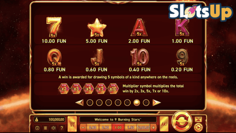 Co vás na online slotu nejvíce zaujme? Pokud je to grafika a celková hratelnost, pak vás 9 Burning Stars pravděpodobně osloví. Na mřížce je 9 pozic, které se točí nezávisle na sobě. Výhry ve hře tvoříte tak, že kdekoli na mřížce roztočíte alespoň pět stejných symbolů. To je poměrně unikátní scénář, zvláště ve hře s uspořádáním 3x3.Před použitím skutečných peněz doporučuji zahrát si 9 Burning Stars v demo režimu. V obou případech budete muset zvolit sázku odpovídající vašemu bankrollu. Ve spodní části rozhraní slotu se táhne široká škála hodnot sázek, která začíná na 0,20 USD za roztočení. Na opačném konci stupnice si můžete zvolit maximum 10 000 dolarů za roztočení. Významné je také to, že si můžete zvolit rychlost otáčení válců pomocí tlačítka nad funkcí automatického přehrávání.