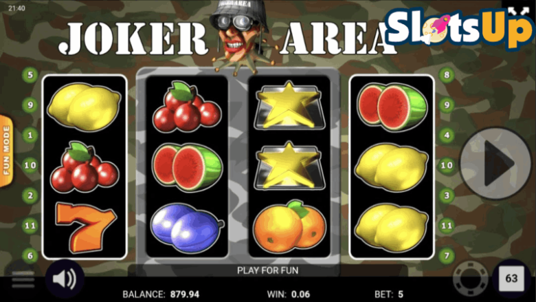 Na váš povel se roztočí 4 válce, a pokud dobře ukrytý žolík přistane na středových výherních řadách, získáte čtyři roztočení za každého žolíka. Joker Area nejenže přináší tradiční hratelnost automatů v novém pojetí, ale přidává také novinku s vojenskou tématikou. Plátno na pozadí hry je postaveno na maskáčích v armádním stylu.