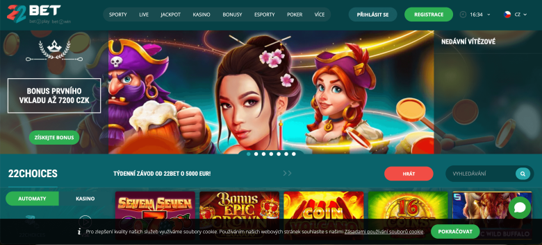 Čeští hráči mohou začít své zkušenosti s 5 Kč vkladem na 22Bet Casino. Je optimalizován pro hráče z České republiky. Jedním z jazyků, které jsou na webu k dispozici, je čeština a noví hráči, kteří se na webu zaregistrují, si mohou jako hlavní měnu zvolit CZK. Jeho minimální vklad činí 5 Kč. Stránka má velkou sekci pokrývající sportovní sázení, včetně fotbalu, basketbalu a esportu. Nicméně stejně široký je i seznam automatů, které jsou k dispozici pro sázky v českých korunách do 5 Kč. Živé kasino se může pochlubit hrami s reálnými krupiéry od lídrů, jako je Pragmatic Play, a nabízí minimální sázky ve výši 1 Kč nebo dokonce 0,5 Kč. Bonusy jsou určeny pro vyšší vklady. Když jste připraveni hrát s větším bankrollem, 22Bet vám může přinést 50 % až do výše 5 500 Kč Wednesday Cash Splash a další výhody.